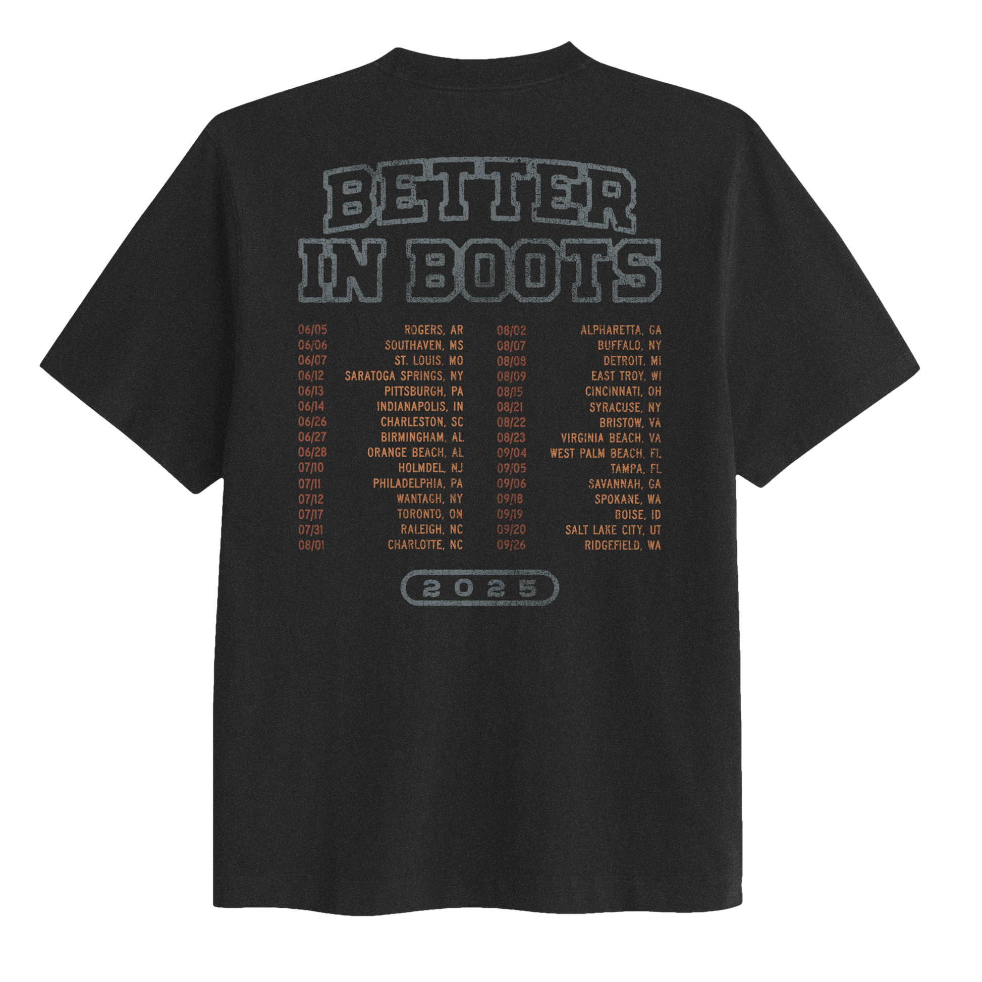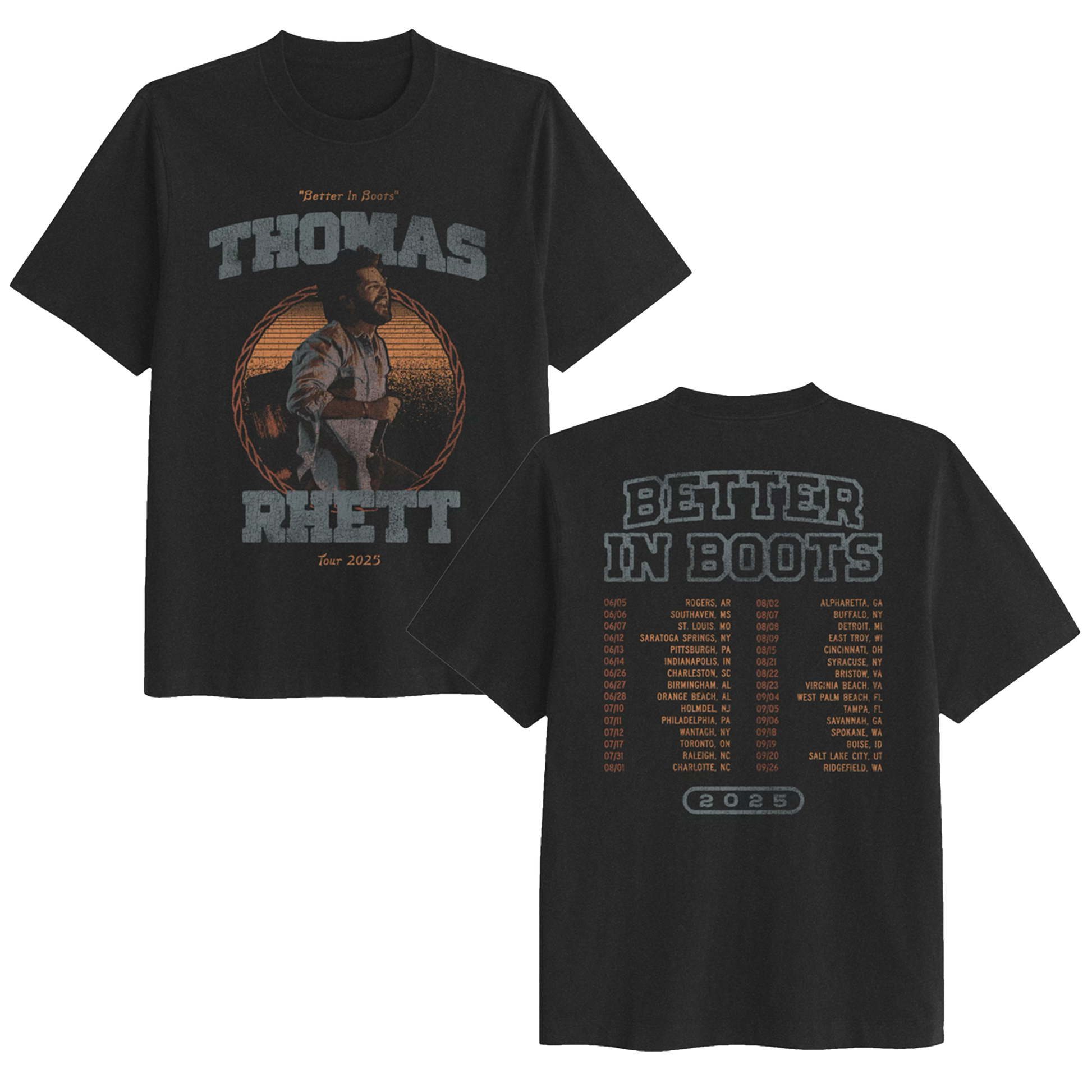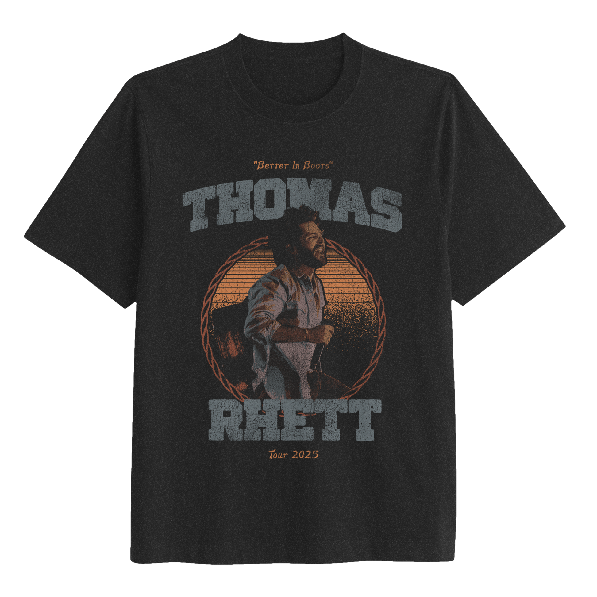 A black unisex tee featuring Thomas Rhett photo on the front and Better In Boots US tour dates on the back.