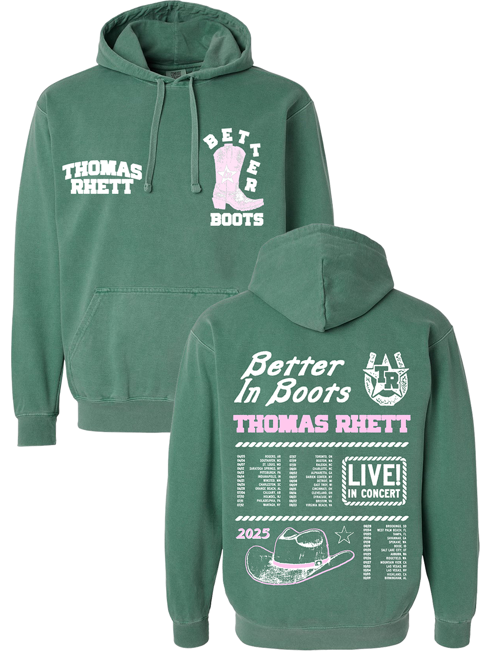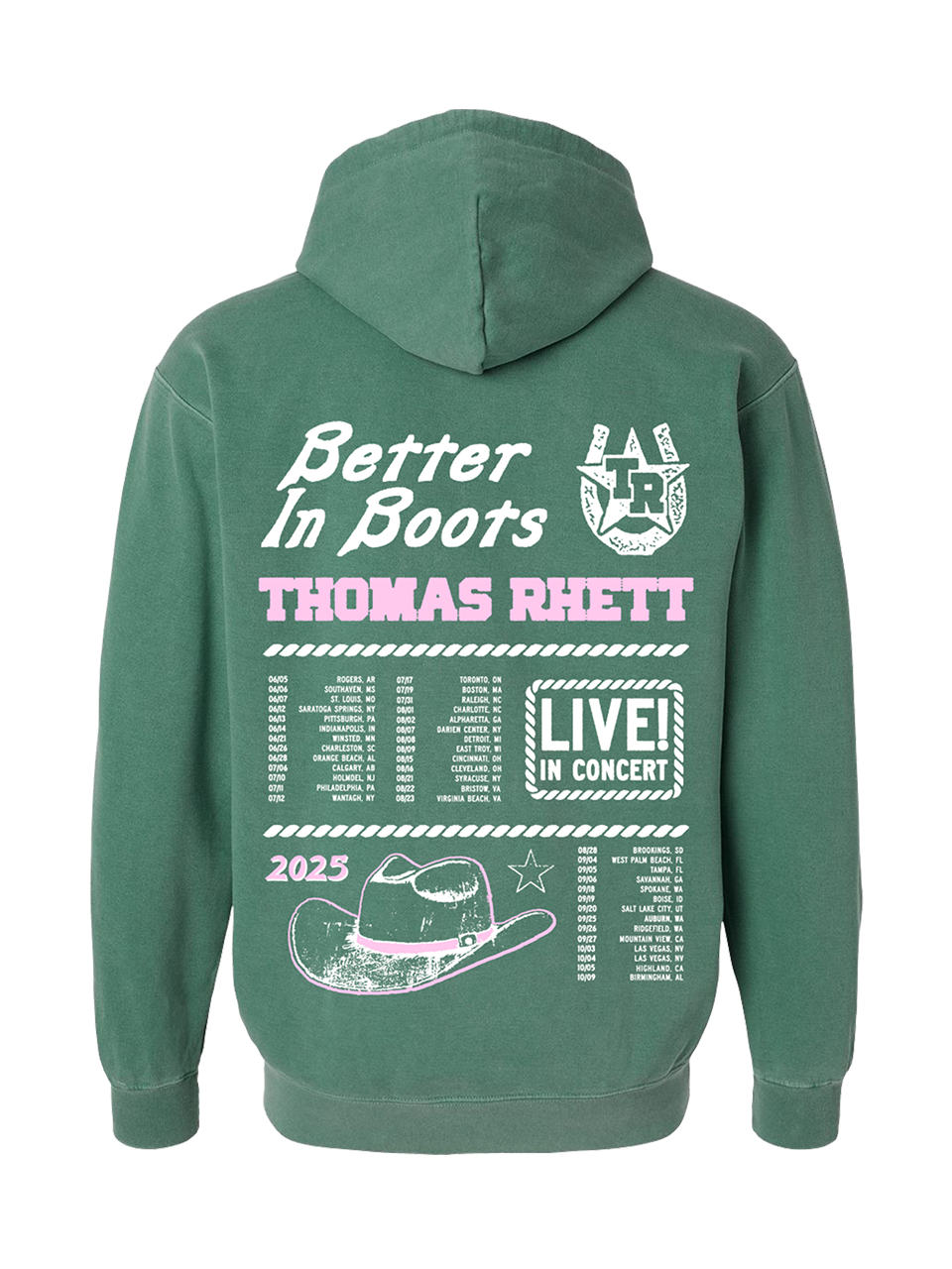 An Independent alpine hoodie featuring Better In Boots and Thomas Rhett art on the front and Better In Boots tour dates on the back.
