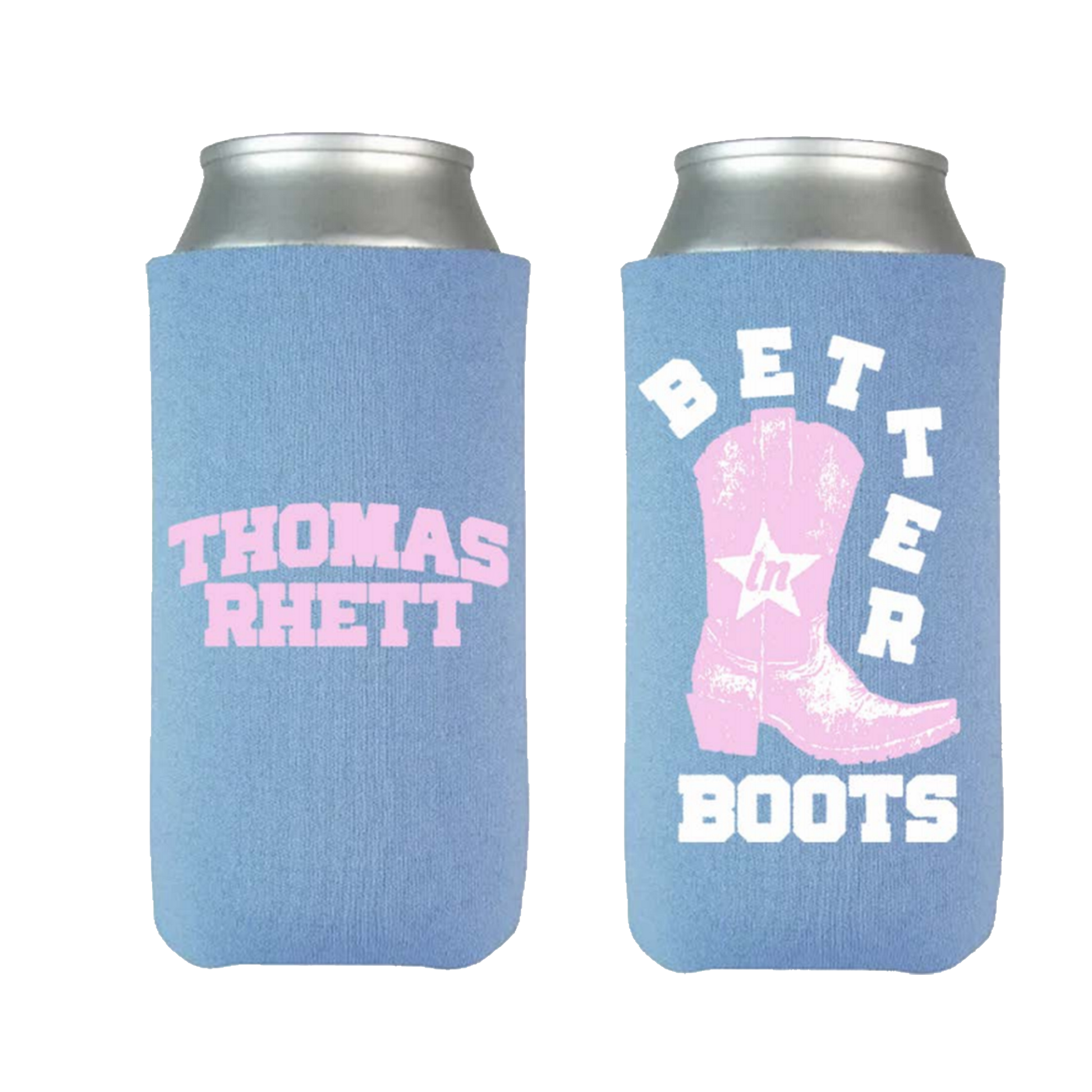Light blue seltzer can cooler with pink Thomas Rhett printed on one side and pink and white Better In Boots art printed on the other.