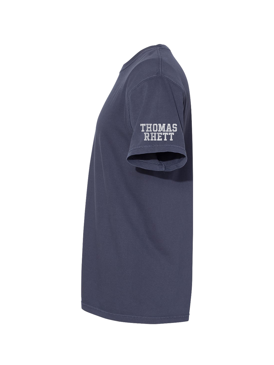 This navy tee boasts the popular title T-Shirt in distressed printing.