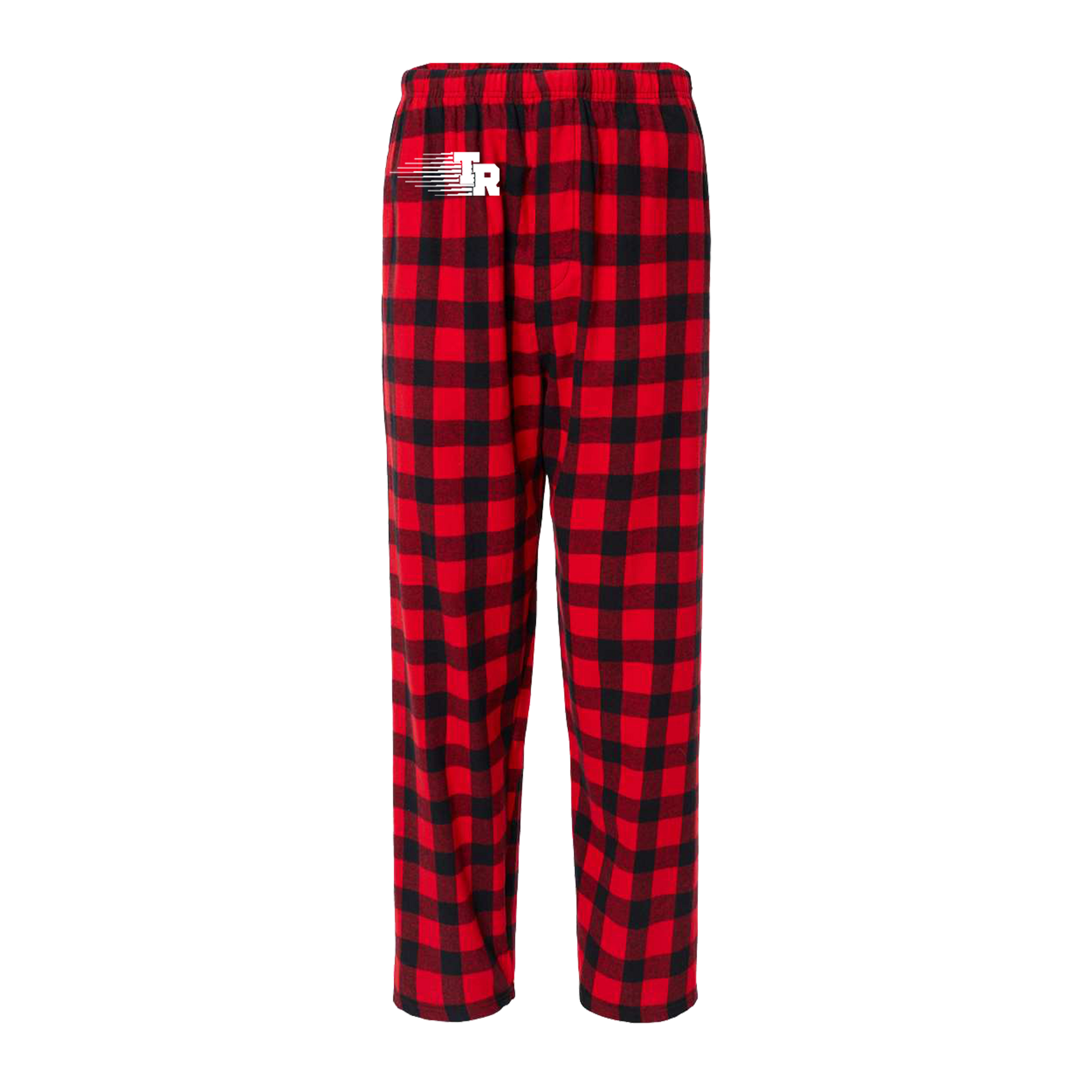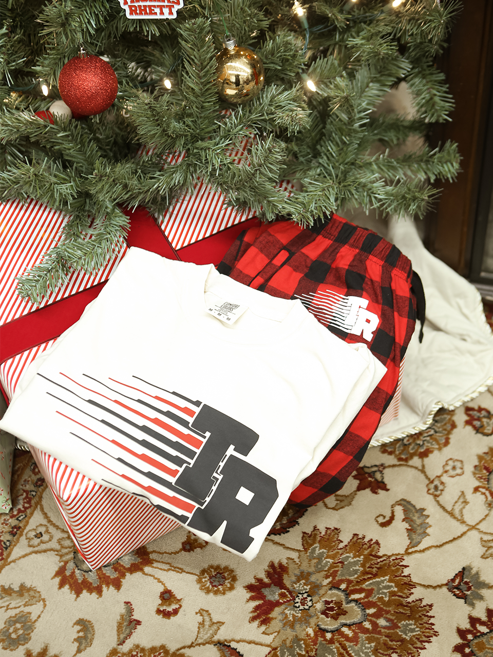 Get cozy this winter with the Thomas Rhett Lounge Set featuring Cotton flannel lounge pants with elastic waist featuring a white striped TR design on the left hip and a unisex ivory long sleeve tee with black and red striped TR art on the front center.